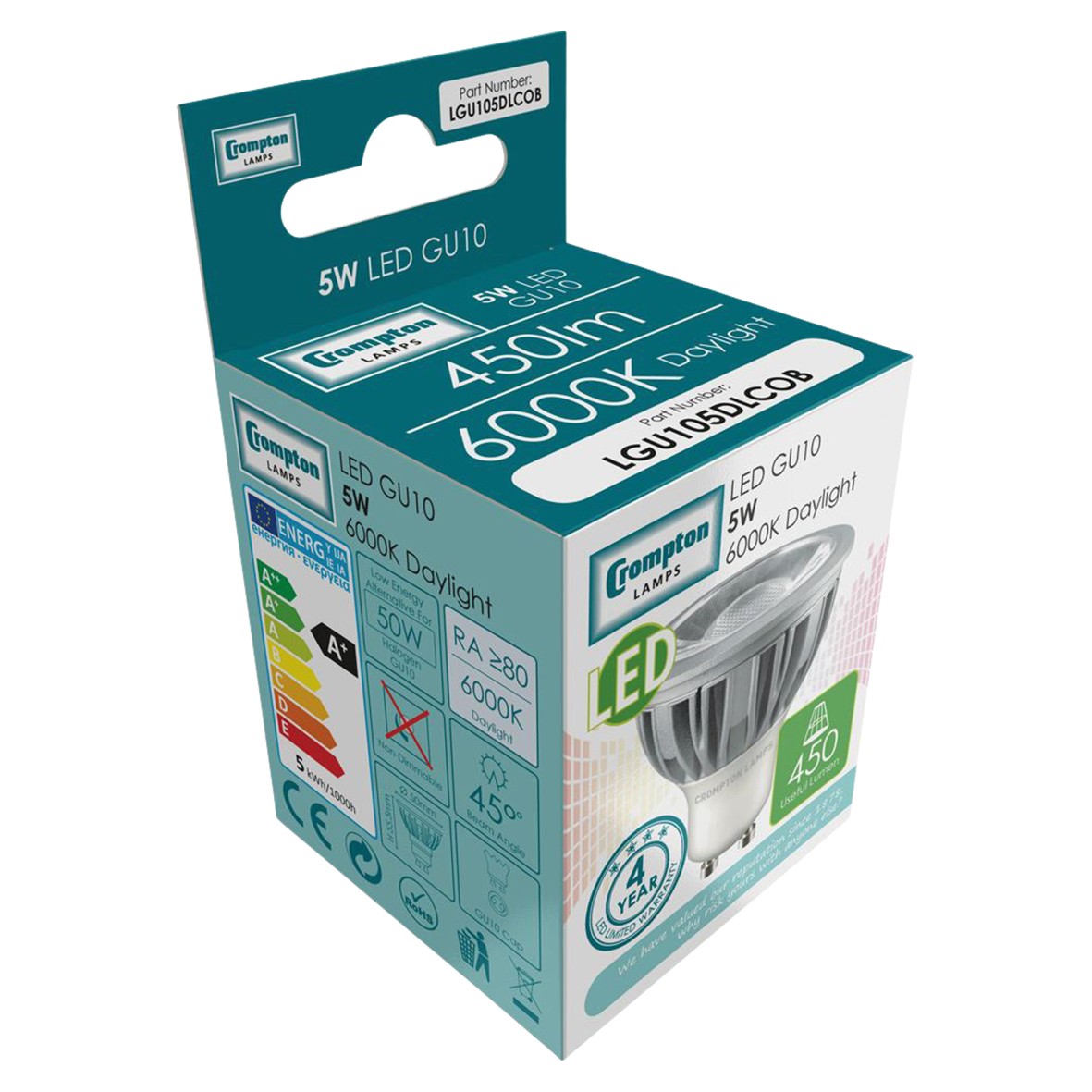 View Product: Crompton 5W LED GU10 COB Lamp – 6000K 685203£2.41£2.89 Ex VATInc VAT