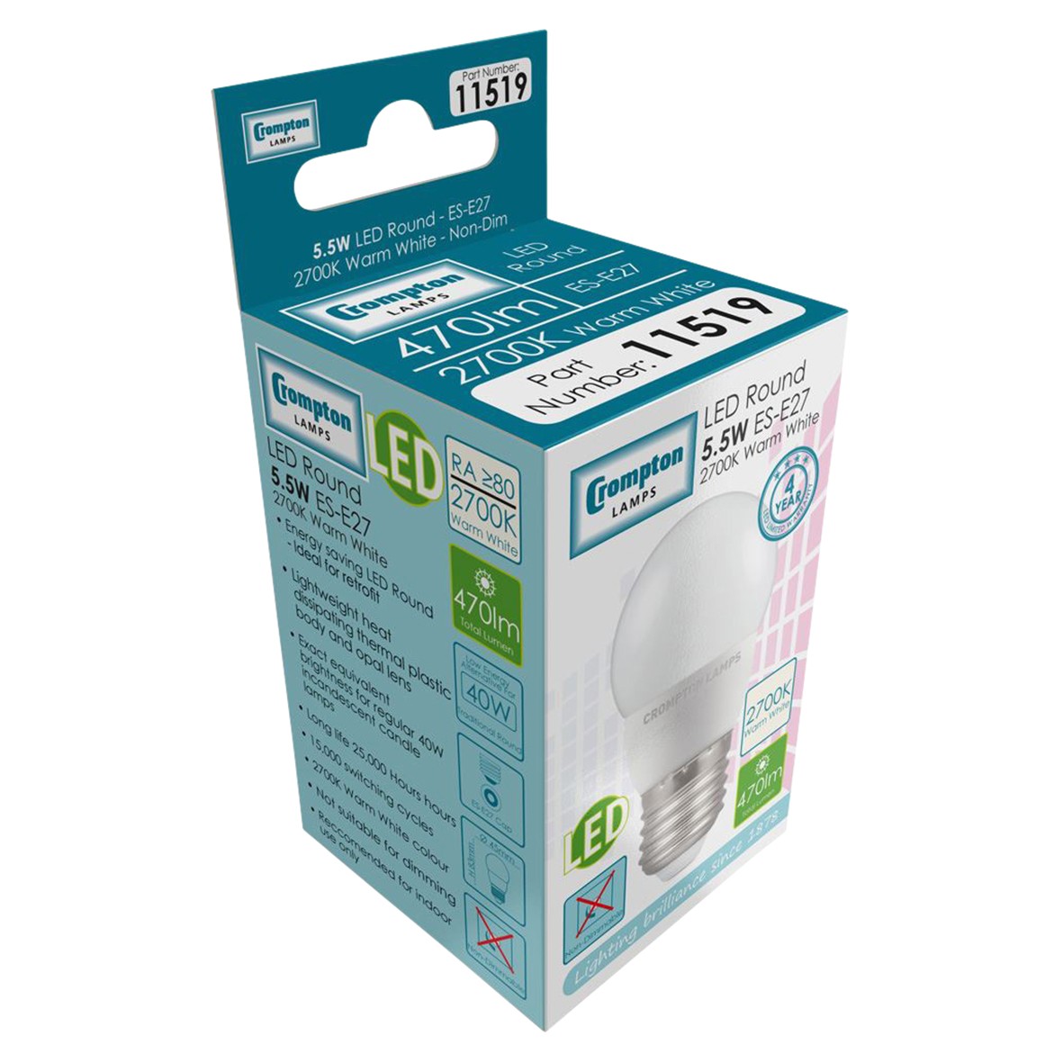 : 5x Crompton 11519 5.5W LED Round Thermal Plastic Lamp – E27 – 2700K 875831