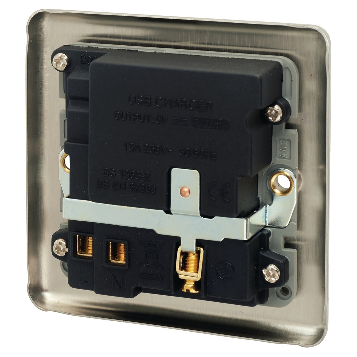 : Schneider Lisse 13A 1 Gang Switched Socket with 2 x USB – Brushed Steel 219731
