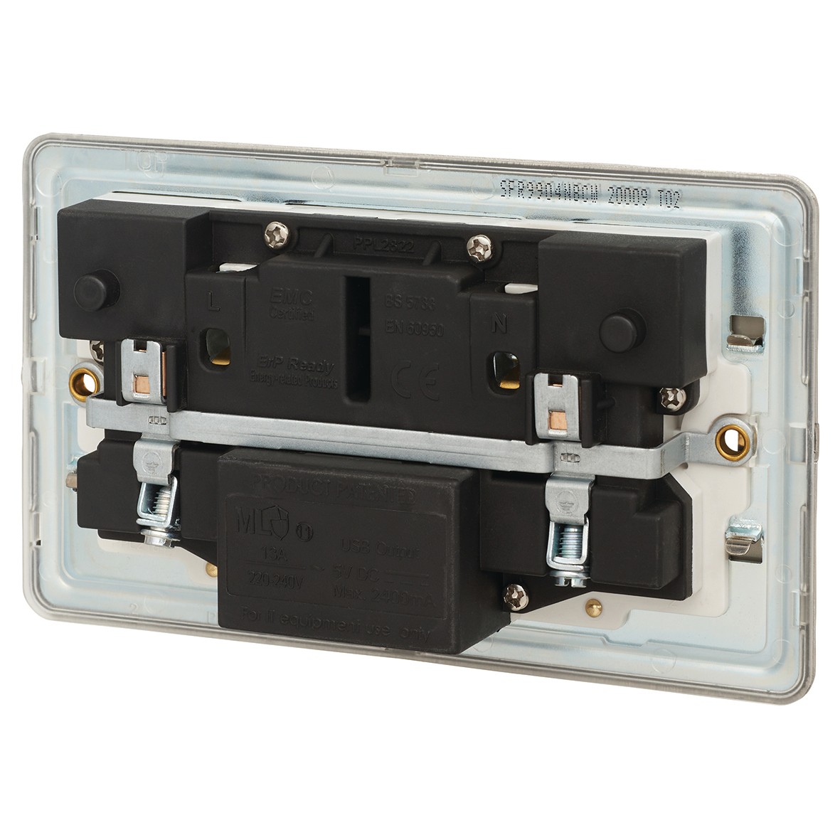 : CONTACTUM 13A 2G SWITCHED SOCKET + 2 USB BRUSHED STEEL WHITE INSERT 000605