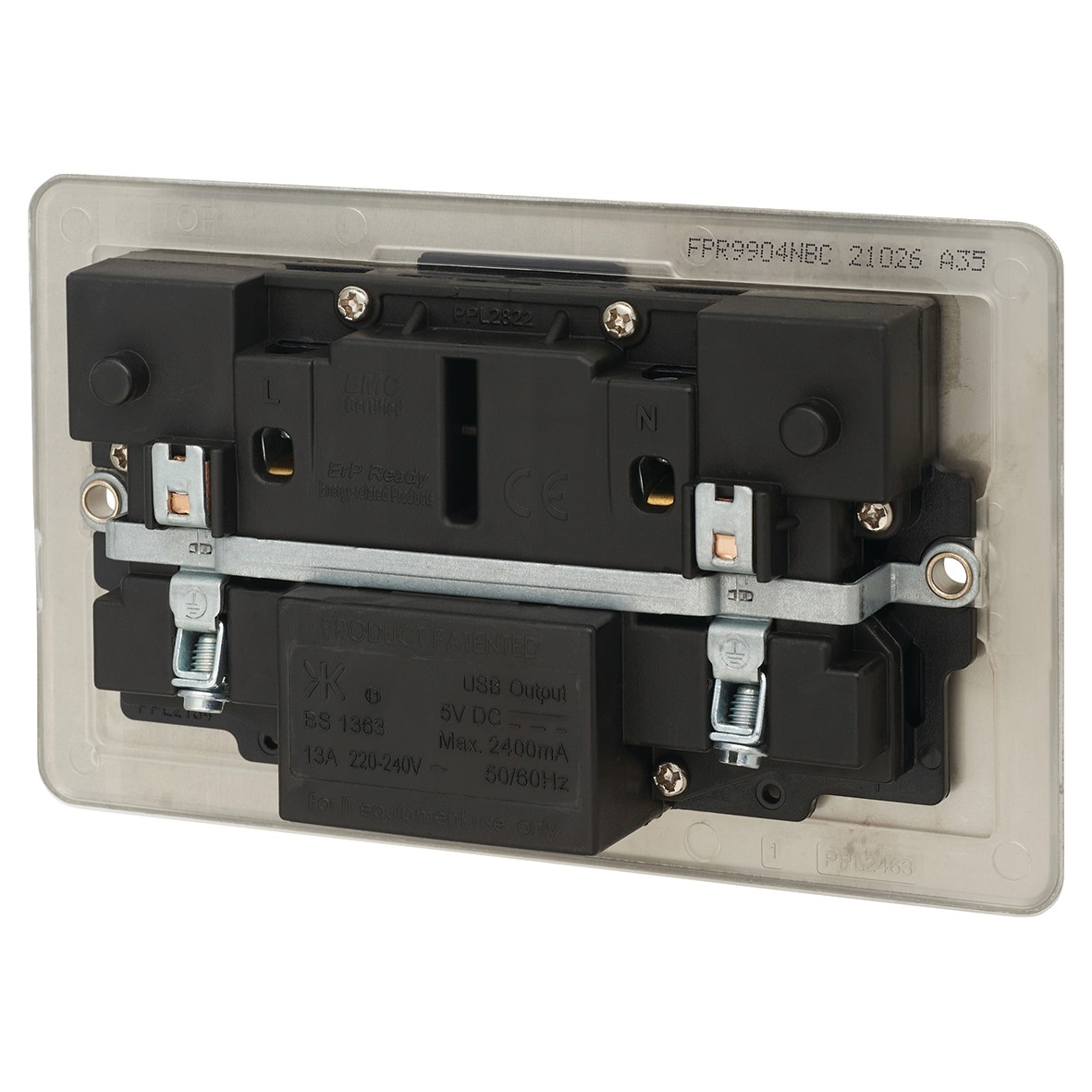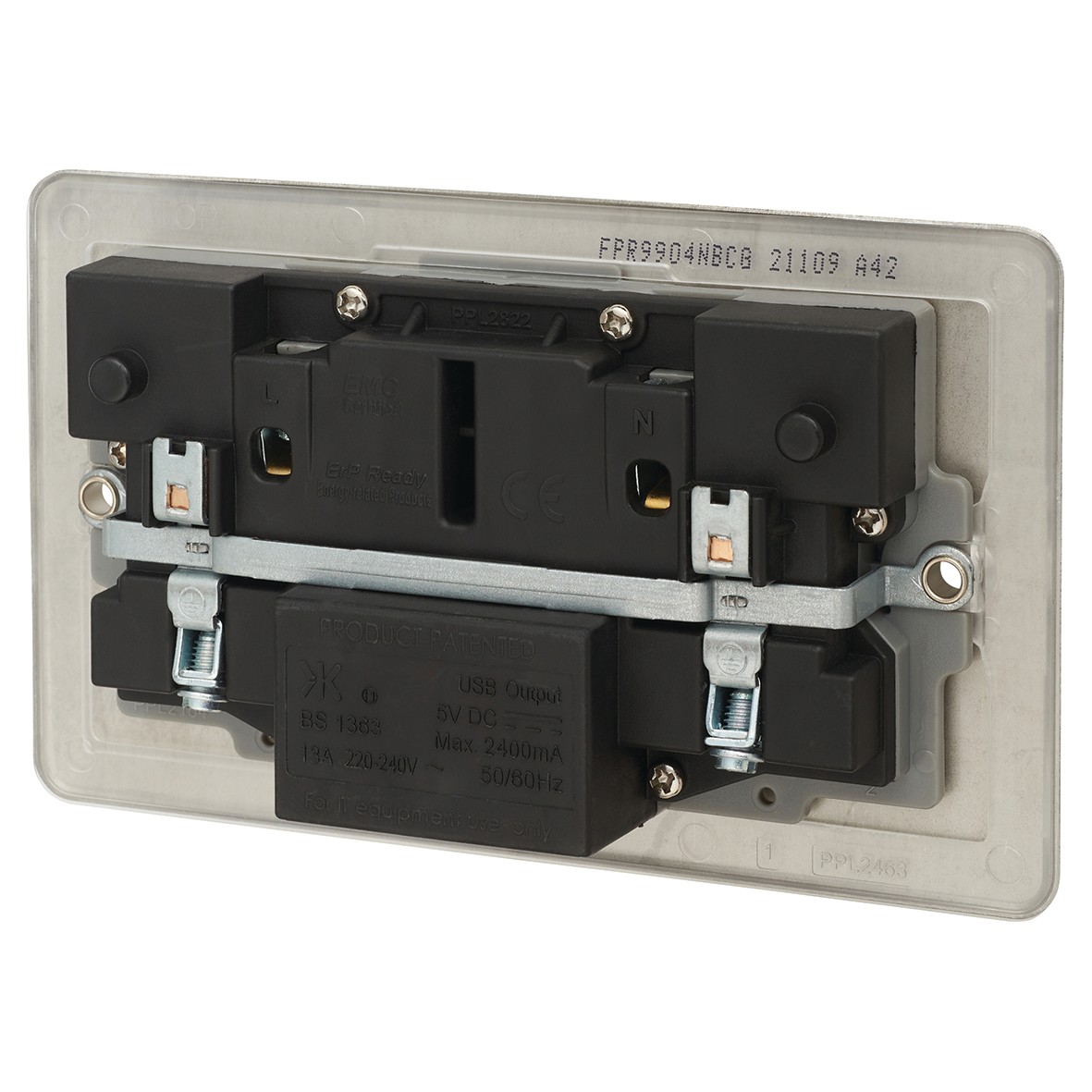 BG SCREWLESS DOUBLE SWITCHED 13A POWER SOCKET + 2 USB 3.1A – BRUSHED STEEL WITH GREY INSERT 000846