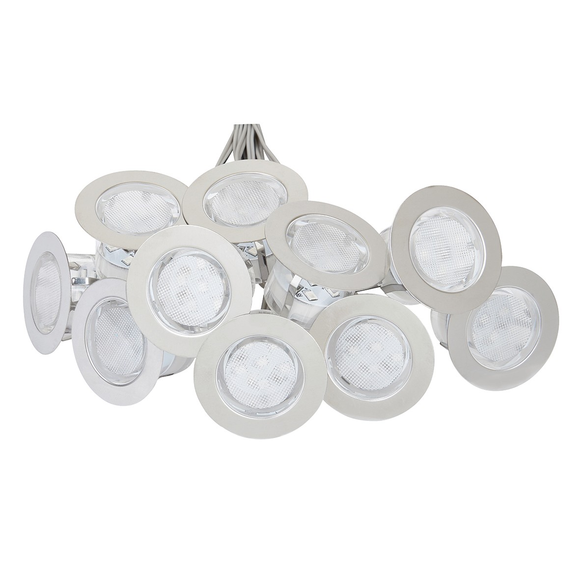 - Contains: 1 x 12V indoor inline transformer with 10m of cable, 1 x outdoor rated 10-way junction box, 10 x LED light fittings each with 3m of cable attached, 1 x junction box blanking plug.
