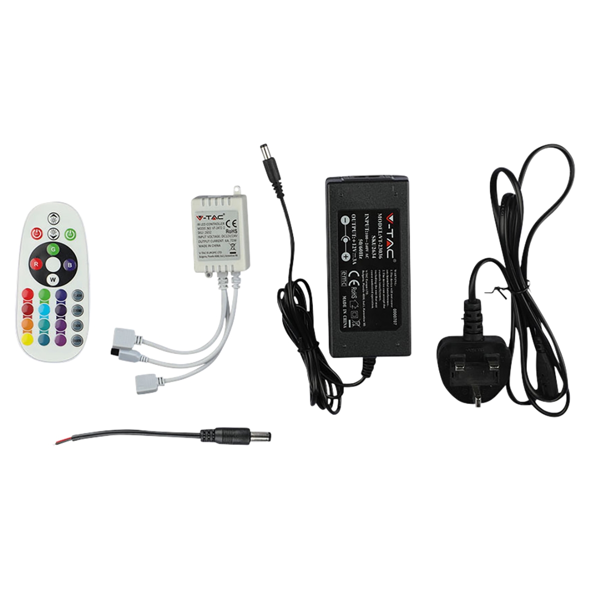 - RGB LED strip light kit with power adaptor and dual output IR controller