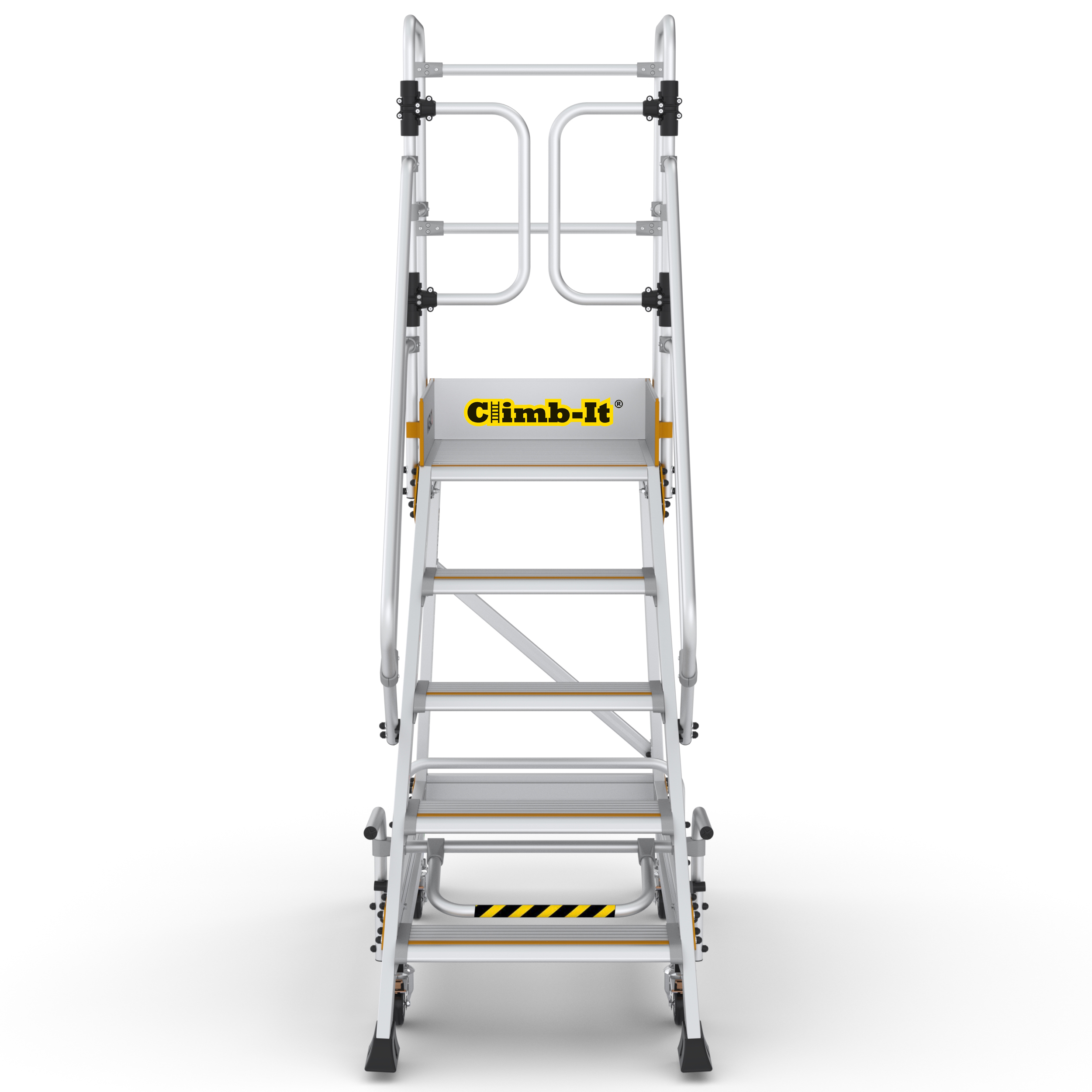 Fully enclosed mobile safety step with spring gates and anti-slip platform – turns within its own footprint.