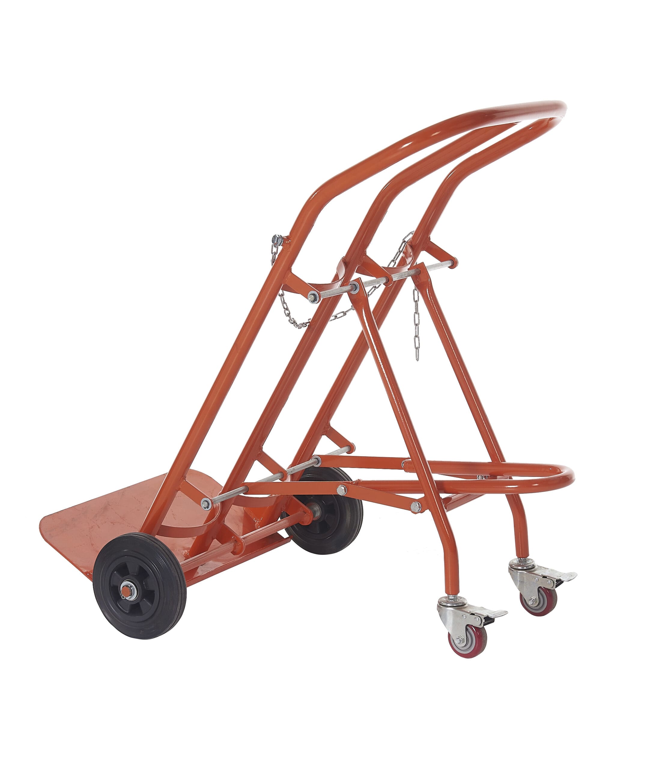 Versatile cylinder trolley converts from a standard sack truck to a 4-wheel configuration, designed for oxygen and acetylene cylinders.