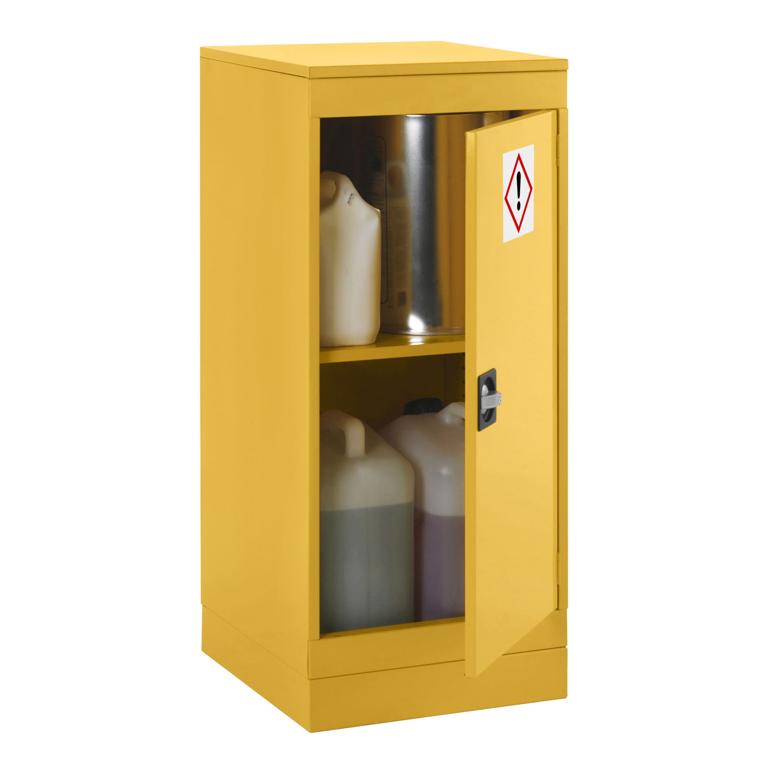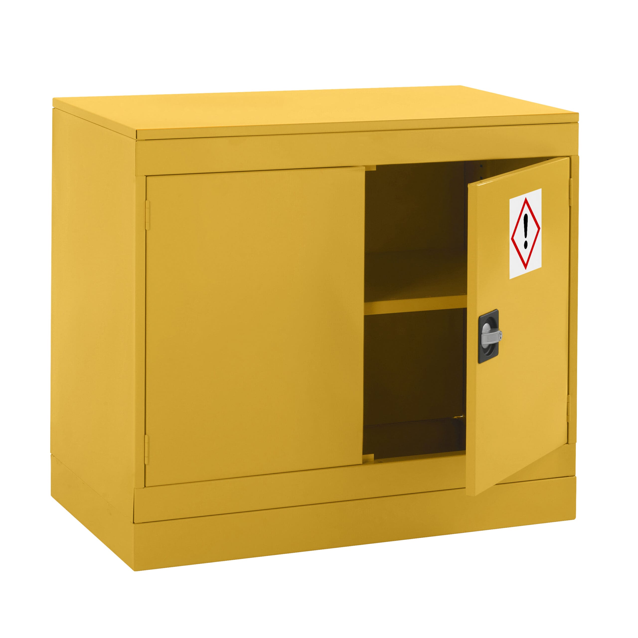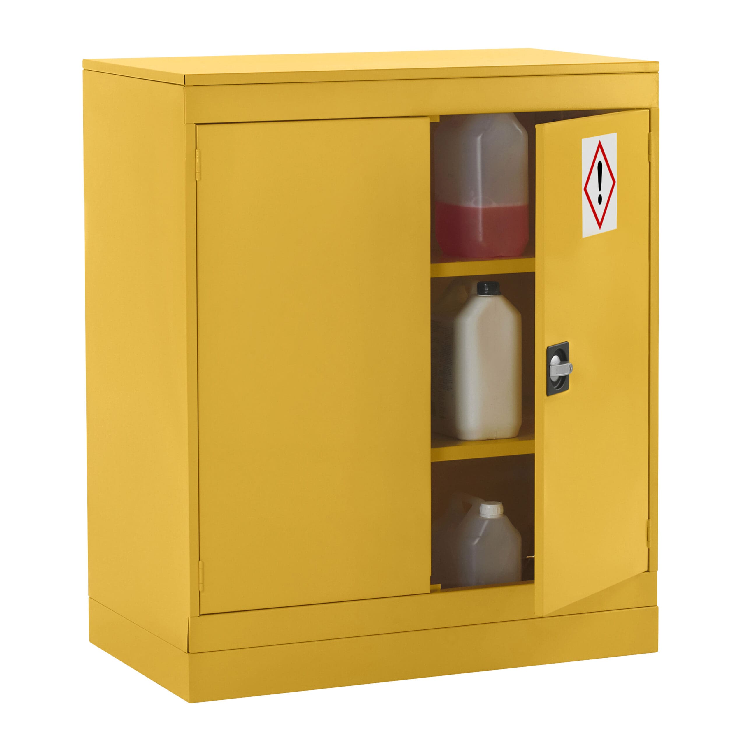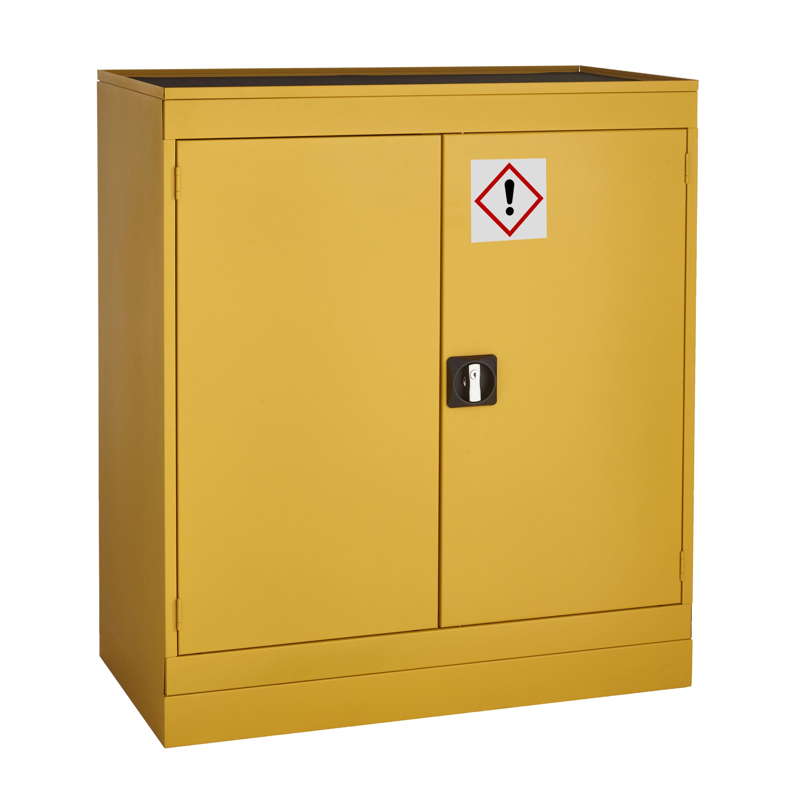 Robust COSHH compliant storage cabinets for hazardous substances, featuring a yellow carcass and doors, integral leak-proof sump, adjustable shelves, and HSE-approved labeling.