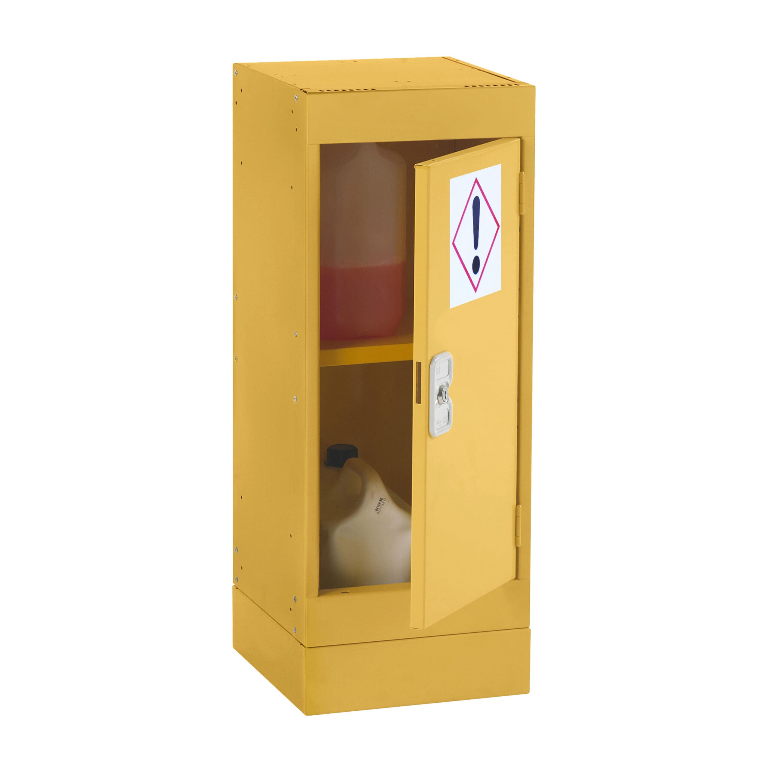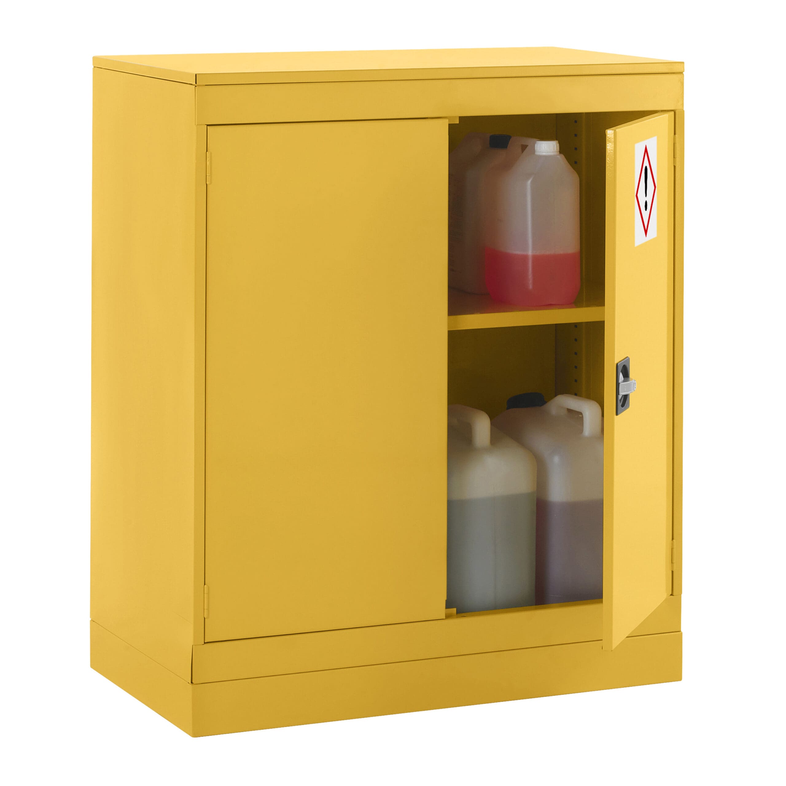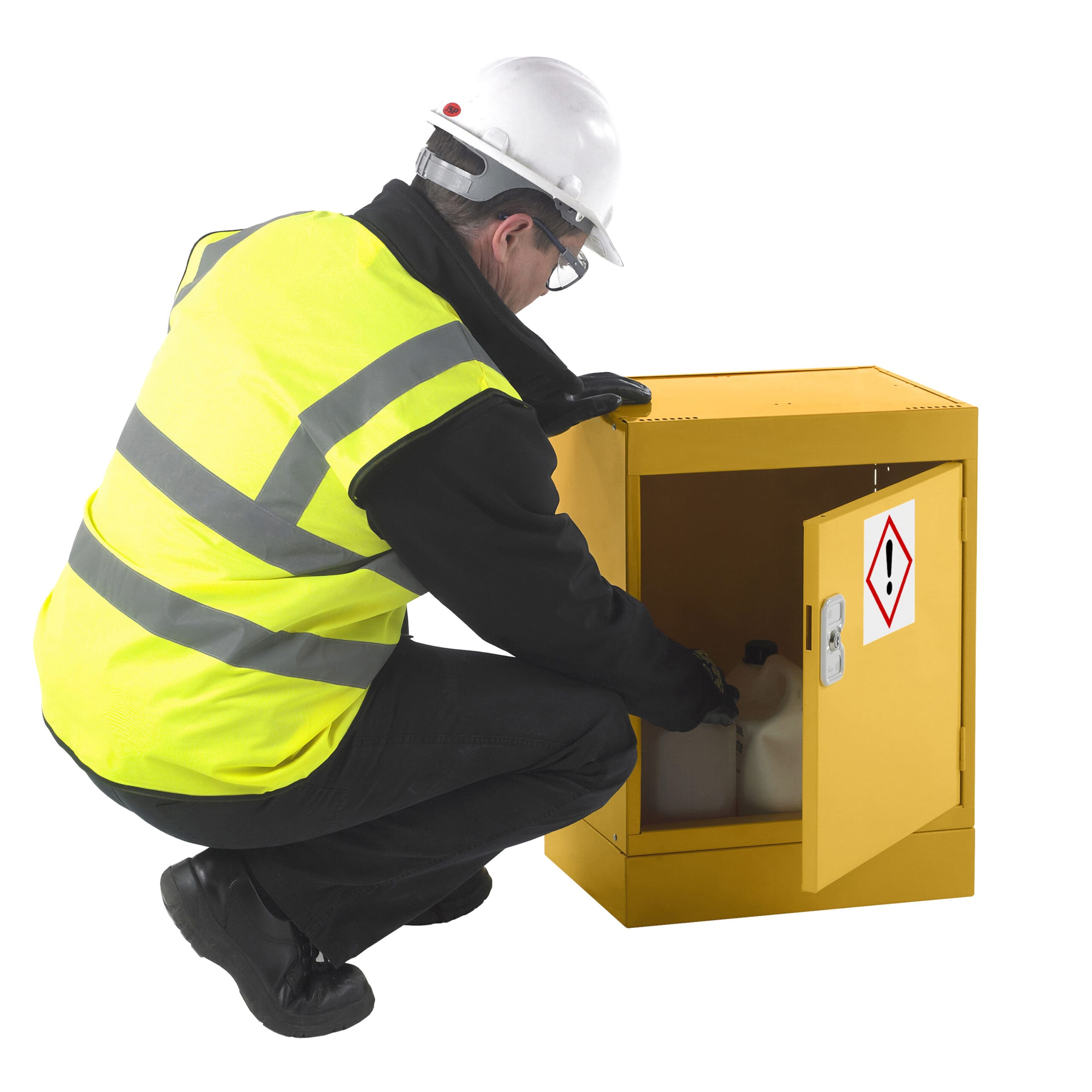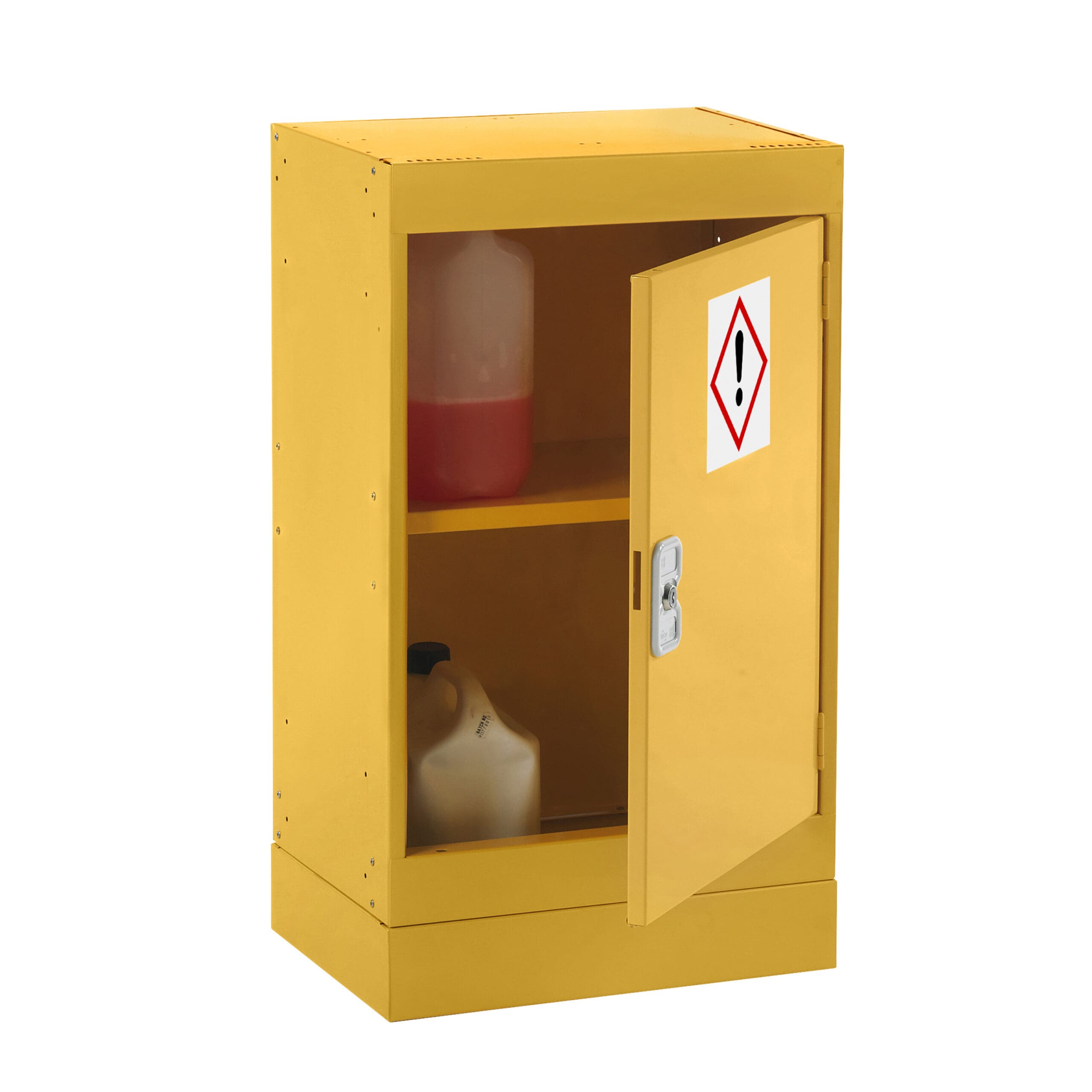Robust COSHH compliant storage cabinets for hazardous substances, featuring a yellow carcass and doors, integral leak-proof sump, adjustable shelves, and HSE-approved labeling.