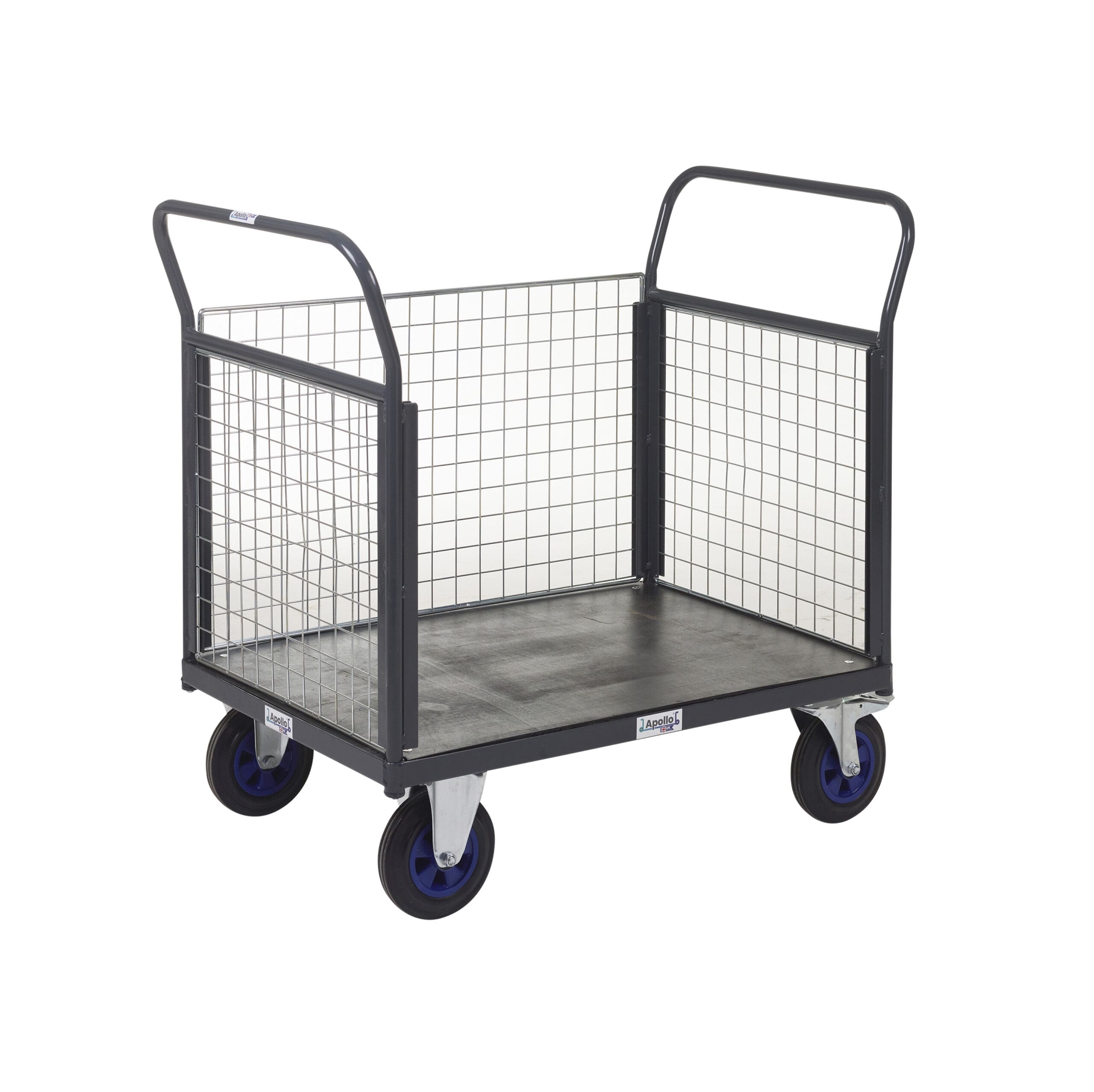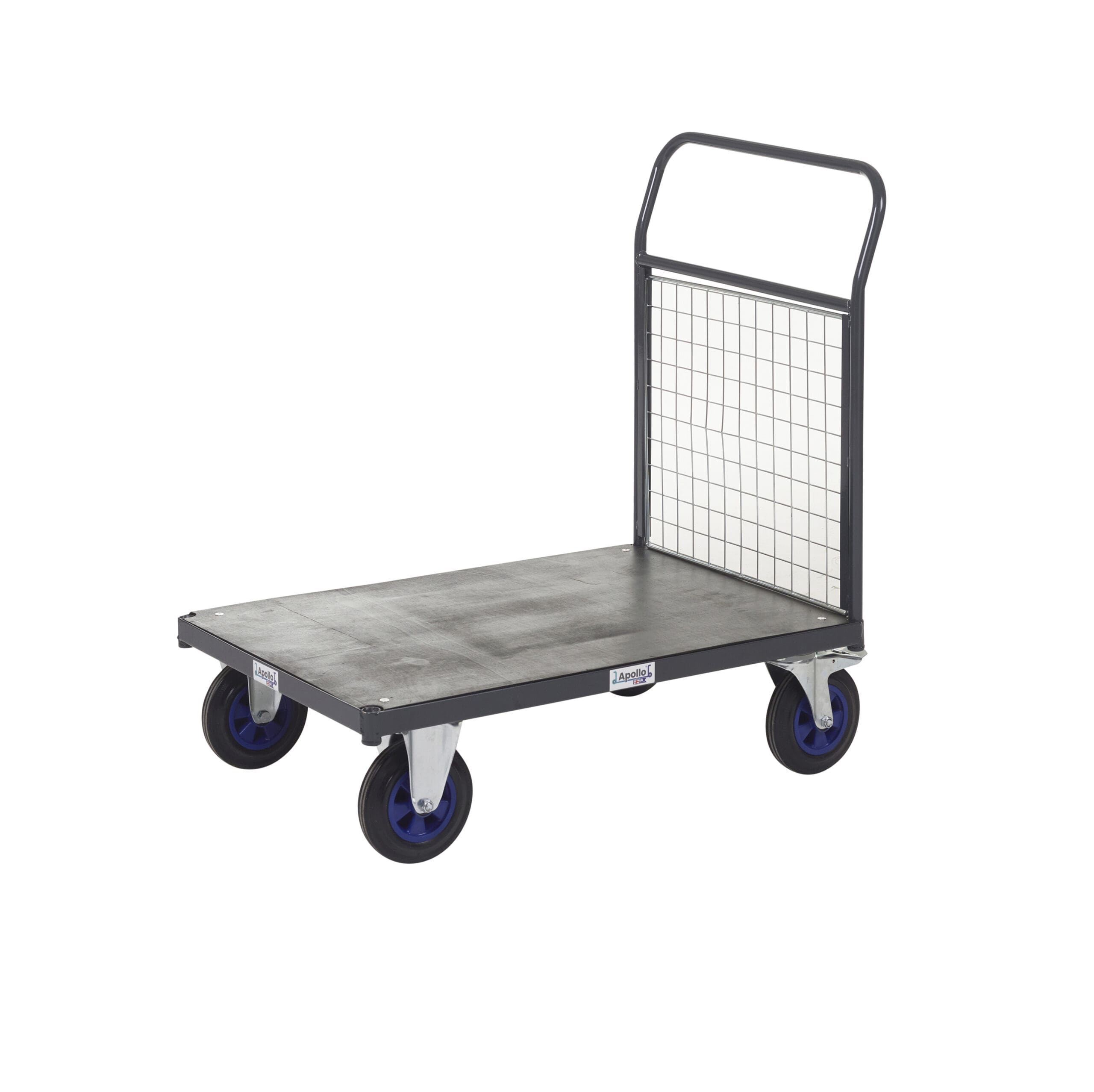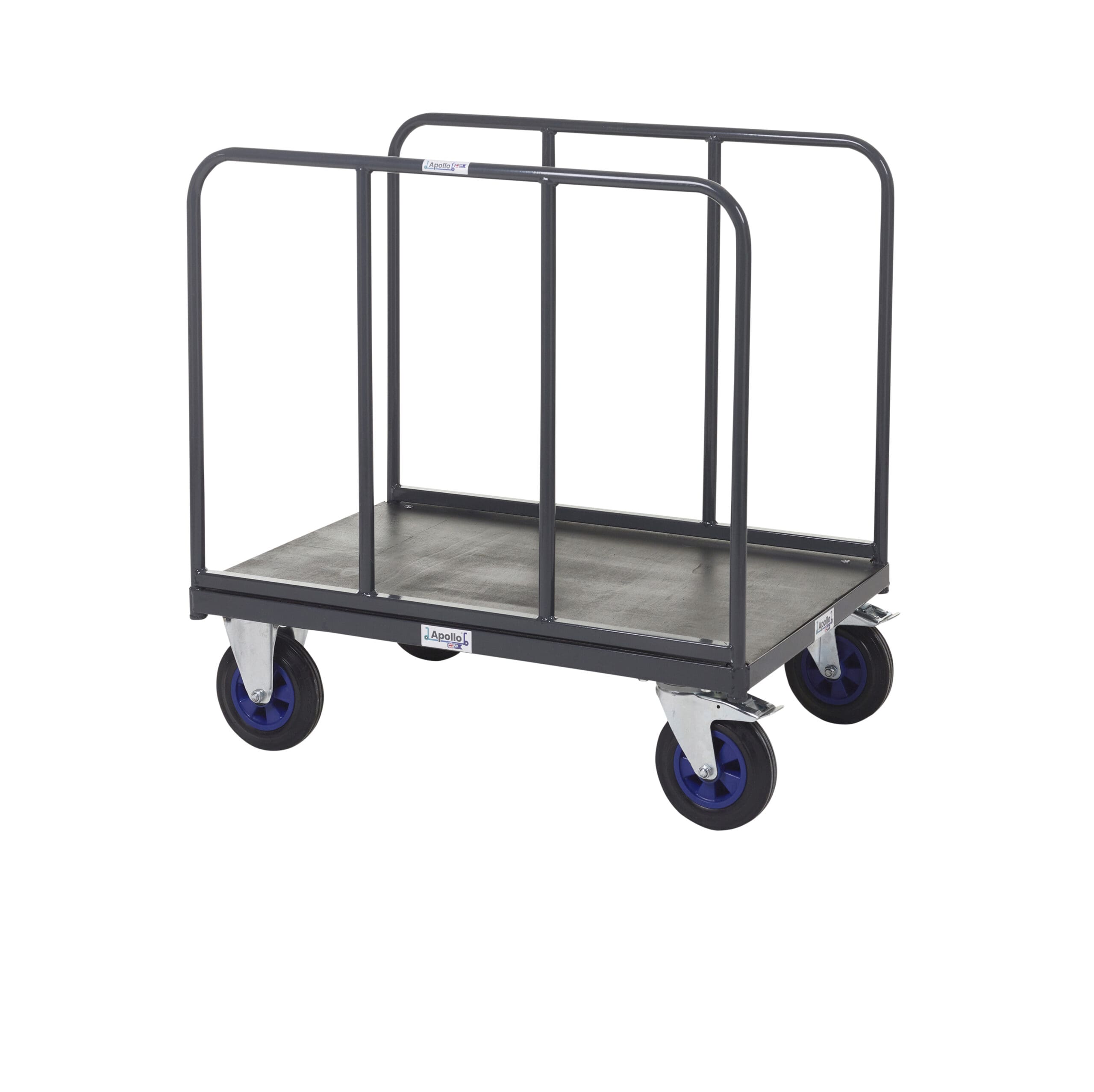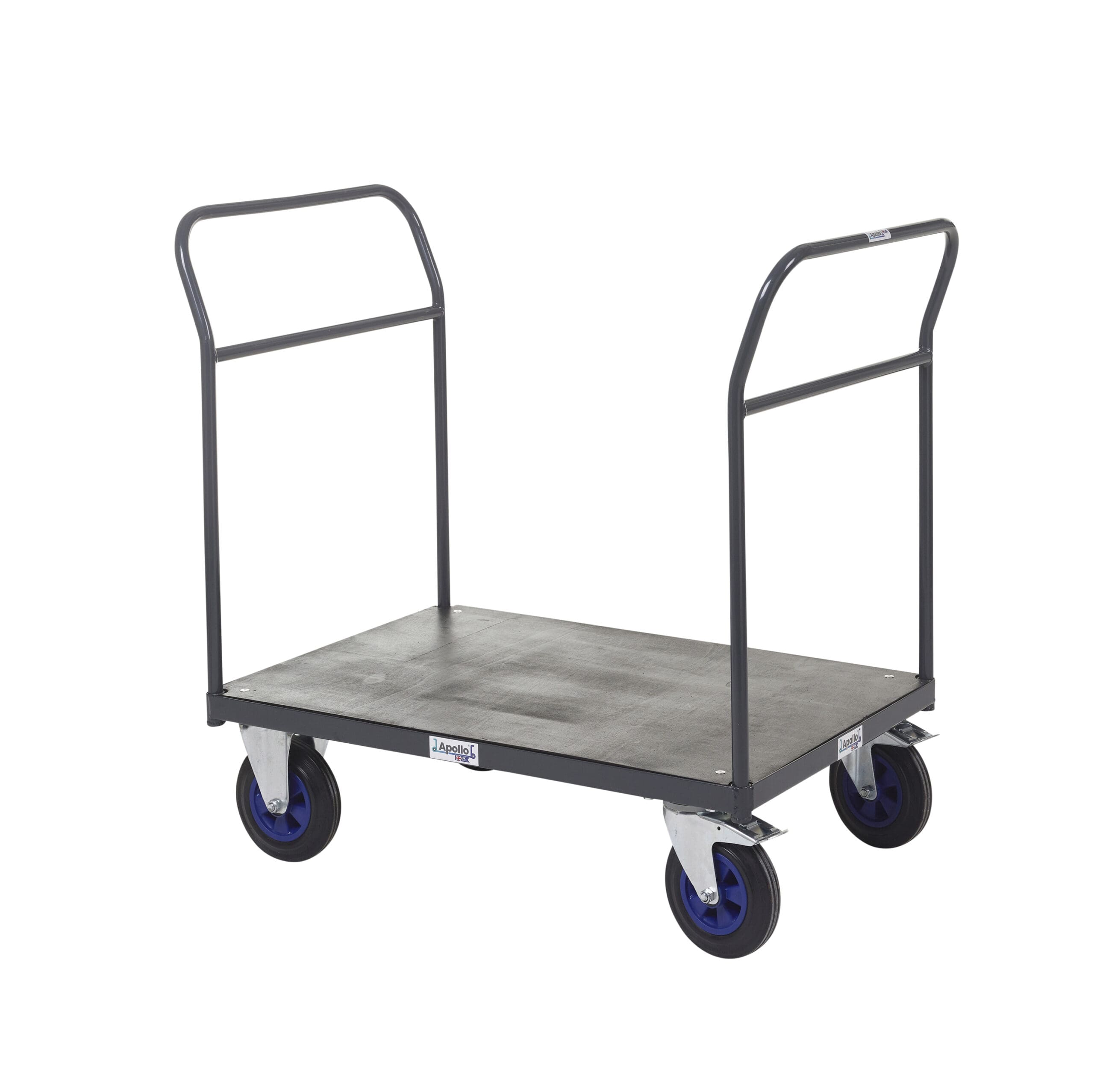 UK-made heavy-duty platform truck with powder-coated steel frame, and smooth-rolling braked castors, 600kg UDL capacity.
