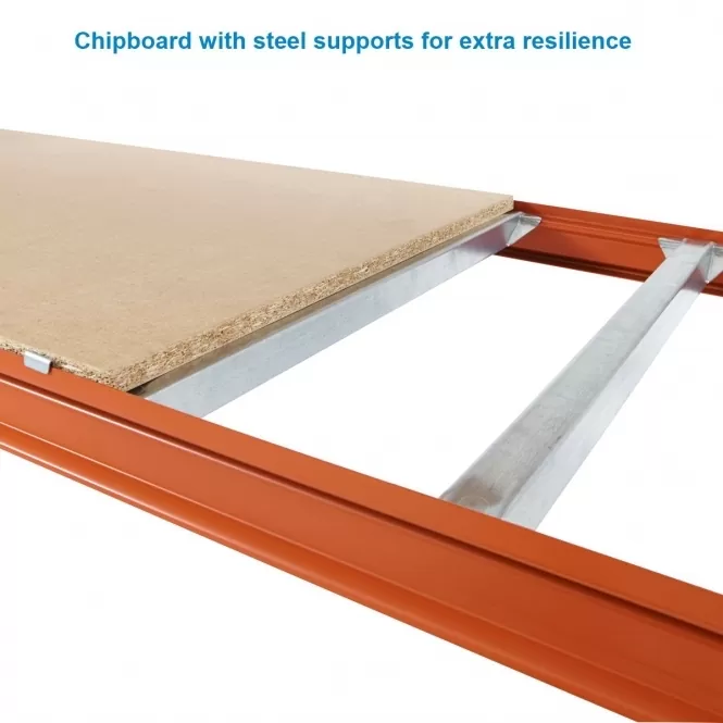 Strong chipboard support beams for use with longspan shelving systems, available in 600mm, 900mm, and 1200mm depths.