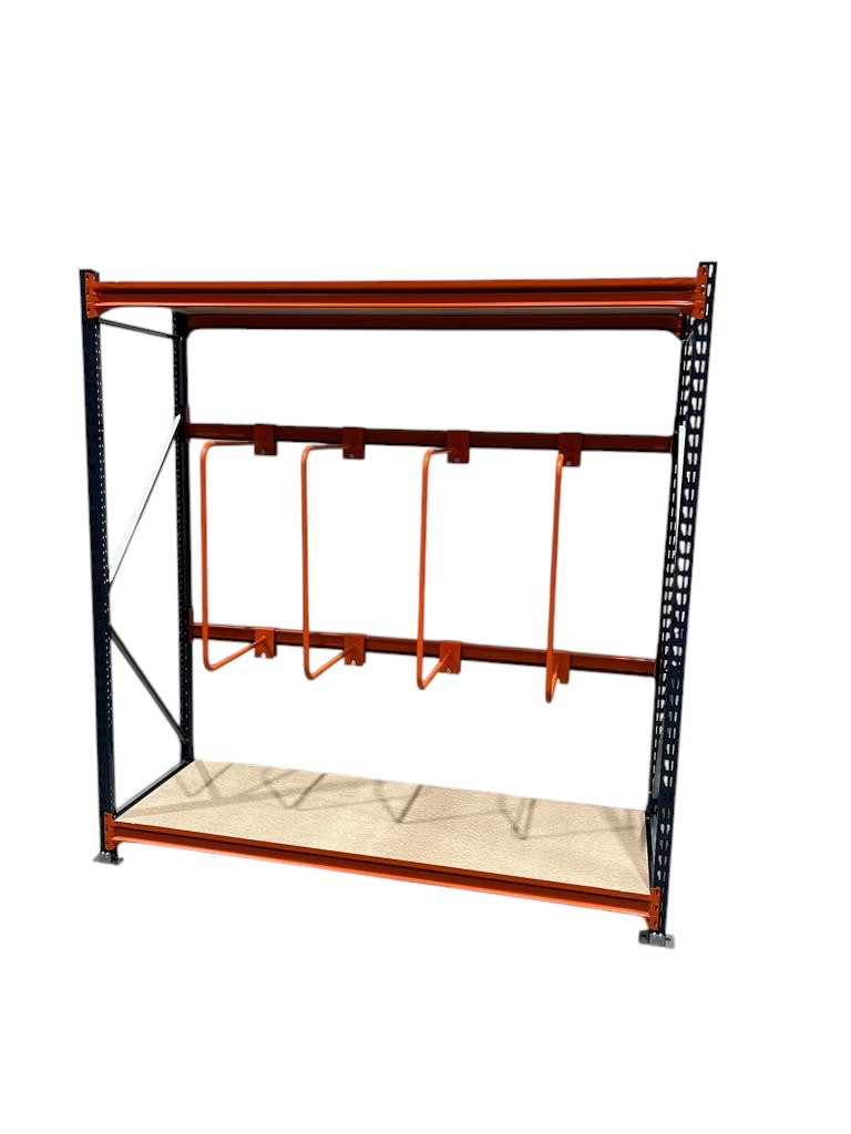 Compact vertical storage rack designed for efficient storage of long, upright items in workshops or warehouses.