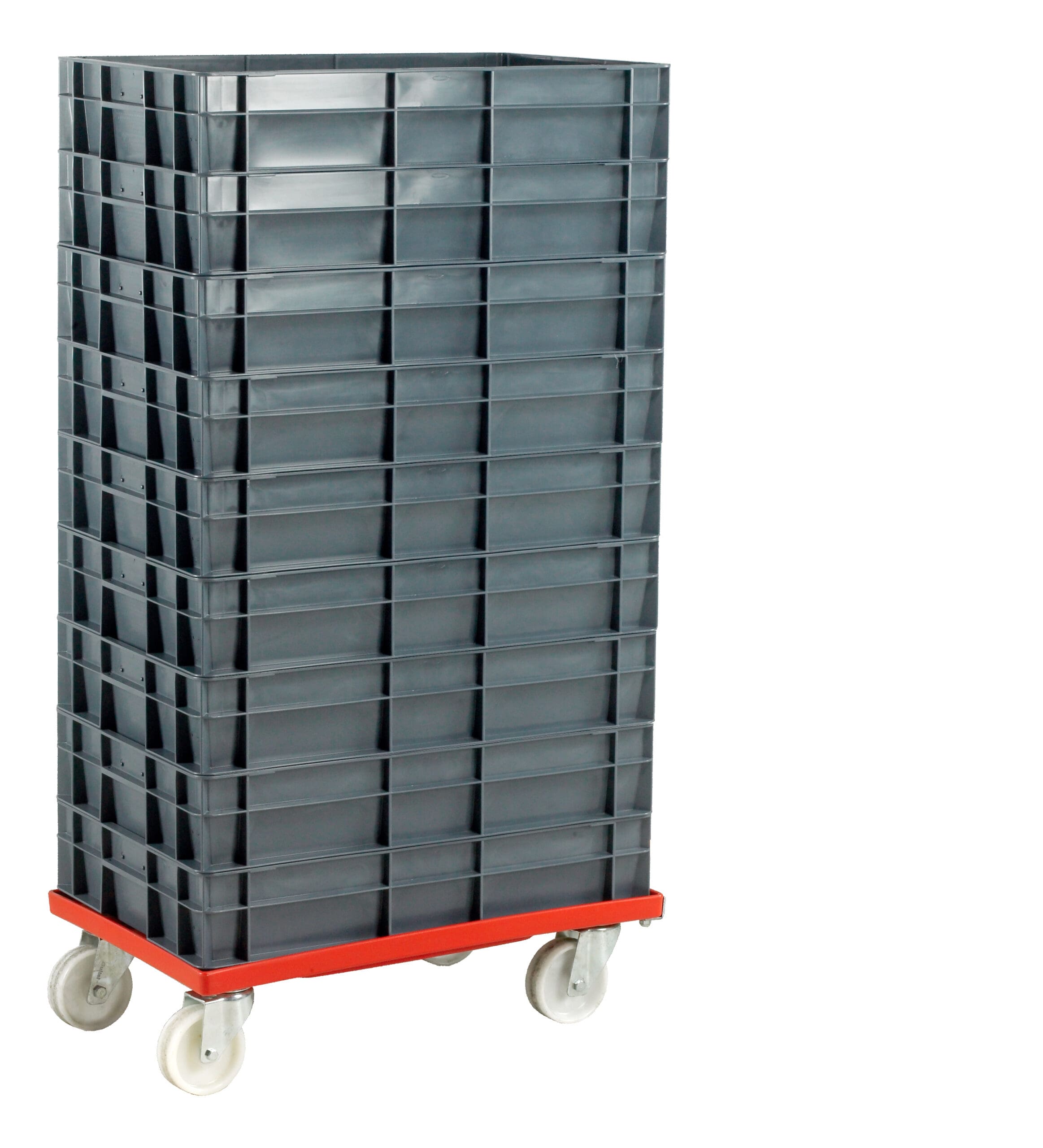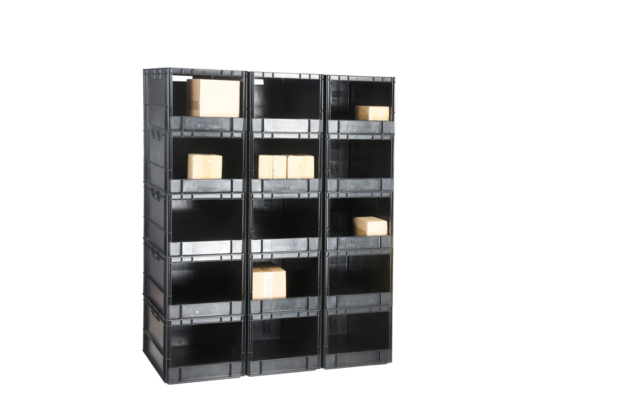 Stackable Euro containers with open fronts for efficient picking and visual inventory control.